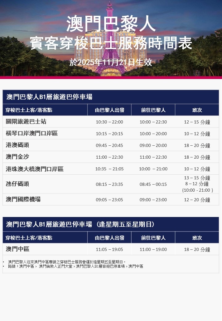 · 澳门巴黎人免費穿梭巴士時間表