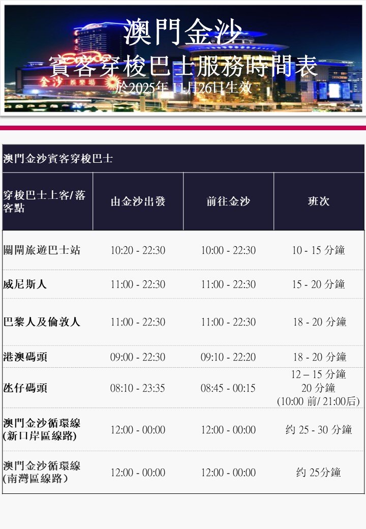 · 澳门金沙免費穿梭巴士時間表