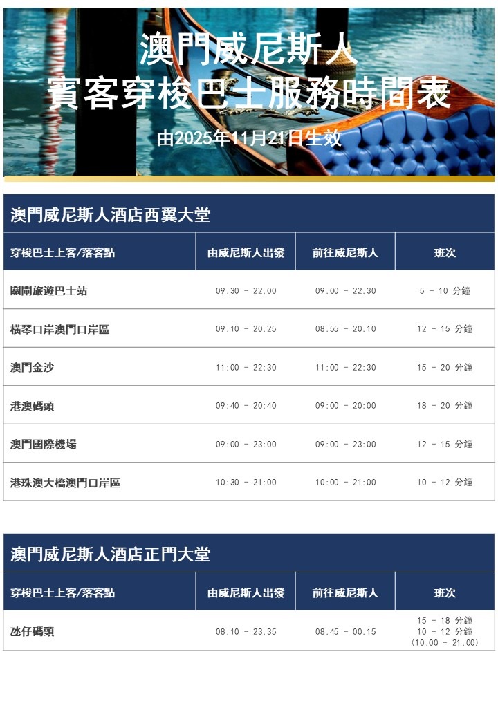 · 澳门威尼斯人免費穿梭巴士時間表